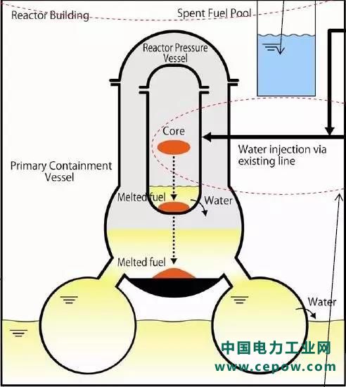 从目前的报道以及日前东电公司给IAEA的事故调查报告来看,实际上压力容器底部早已经熔穿,核燃料流出容器底部后正在熔毁壳内一个金属格栅法兰状结构,此构件已查明是压力容器下的铁质脚手架。