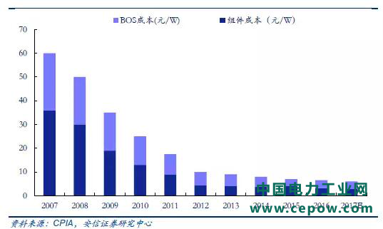 光伏发电系统投资主要由组件、逆变器、支架、电缆等主要设备成本,以及土建、安装工程、项目设计、工程验收和前期相关费用等部分构成,其中,组件和逆变器等主要设备成本占比分别为45%和4%。近年来,随着技术进步带来组件和逆变器等主要设备成本的下降,以及组件转换效率提高带来的支架、电缆、安装等配套成本的下降使得光伏发电系统成本持续下降,光伏系统成本由2007年60元/W降到目前6元/W,而“自发自用,余电上网”模式的分布式度电补贴自2013年以来一直维持0.42元/kwh的水平,从而使得户用分布式电站的投资收益逐步具备吸引力。