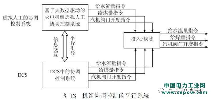 机组协调控制是火力发电的关键环节,规划建立实现火电机组协调优化的虚拟人工系统. 采用大数据挖掘技术, 分析煤质变化、司炉经验、负荷变化、排放要求等, 形成虚拟人工模型; 采用知识发现等人工智能技术, 实现虚拟人工的协调控制模型. 如图13, 虚拟人工系统和DCS 中的协调控制系统之间采用信息交互, 实现数据驱动; 采用平行引导, 实现平行执行. 设置投入/切除环节是为了增加系统的可靠性.