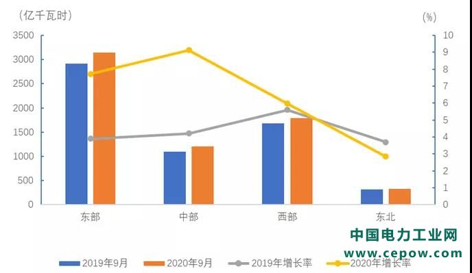 1-9月,东、中、西部和东北地区②全社会用电量分别为25636、10163、15262和3073亿千瓦时,增速分别为0.4%、-0.4%、4.2%和0.6%。