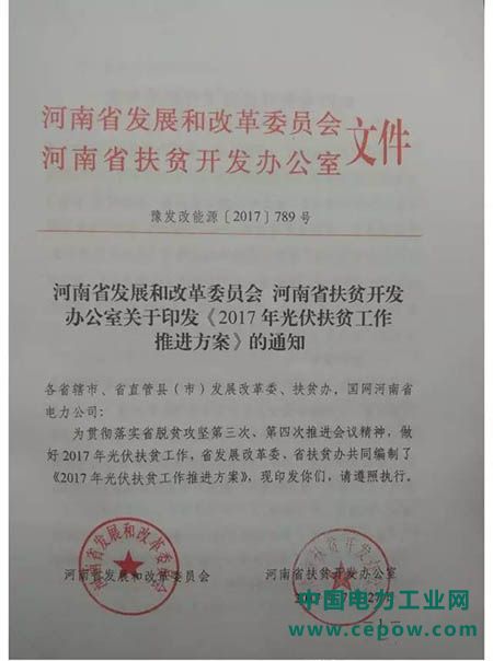 河南省发展和改革委员会河南省扶贫开发办公室关于关于印发《2017年光伏扶贫工作推进方案》的通知