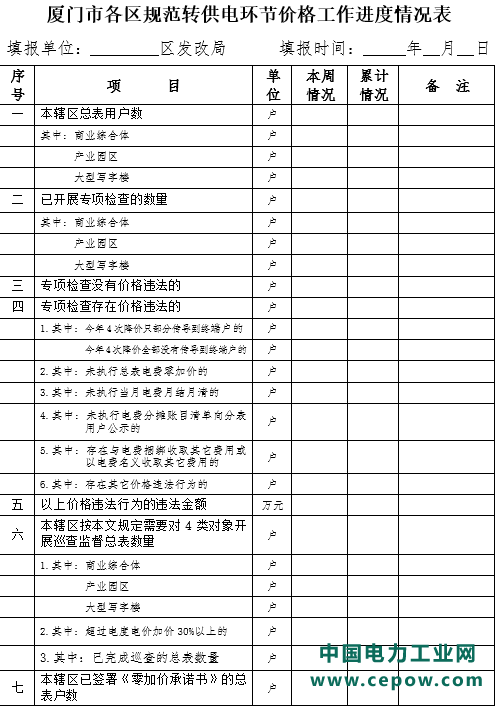 2.一周一报报告工作进展情况。省物价局要求各地每周一次报告清理规范转供电价格政策贯彻落实情况。从本周开始至工信部组织的评查结束期间,请各区发改局和国网厦门供电公司在每周五下班前通过邮件(邮箱:fg_chenws@xm.gov.cn)向我委报送各自一周内开展工作的情况。各区发改局按附表1、2填报;国网厦门供电公司重点报送接收非直抄改直抄的进度等情况。