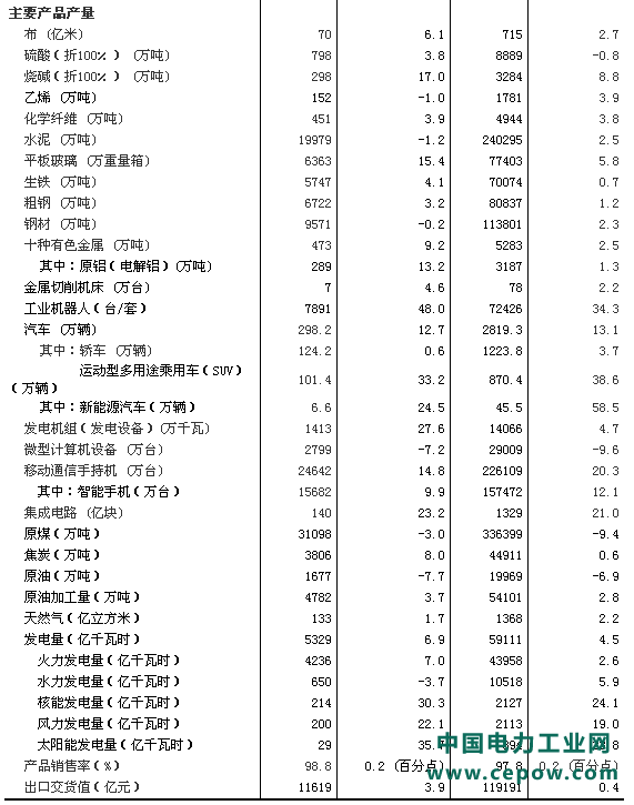 分产品看,12月份,统计的589种主要产品中有376种产品同比增长。其中,钢材9571万吨,同比下降0.2%;水泥19979万吨,下降 1.2%;十种有色金属473万吨,增长9.2%;乙烯152万吨,下降1.0%;汽车298.2万辆,增长12.7%;轿车124.2万辆,增长0.6%;发电量5329亿千瓦时,增长6.9%;原油加工量4782万吨,增长3.7%。