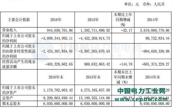 华锐风电今日发布2016年年度业绩报告。报告指出,2016年华锐风电总营业收入为9.45亿元,同比减少32.17%;归属上市公司净利润亏损30.99亿元。