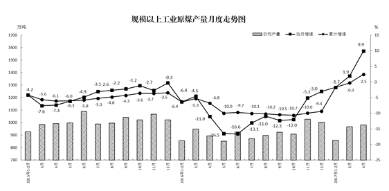 原煤产量恢复性增长。4月份,原煤产量2.9亿吨,同比增长9.9%;日均生产982万吨,比3月份增加15万吨。1-4月份,原煤产量11.1亿吨,同比增长2.5%。原煤产量增速较快,主要是因为去年同期原煤产量较低,与3月份日均相比仅增长1.5%。