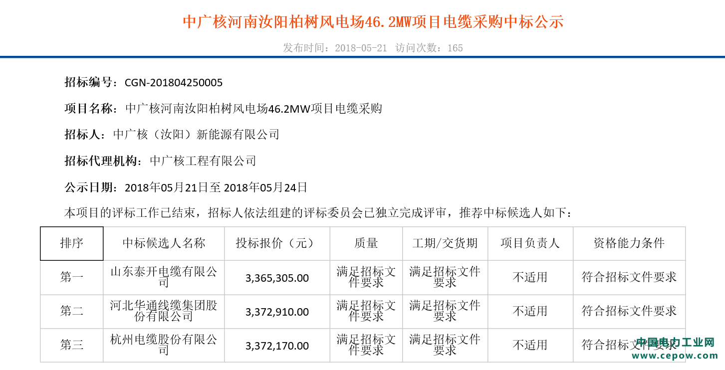 近期(5月19—5月24),中广核电力商务平台公布7个风电项目中标人及报价公示: