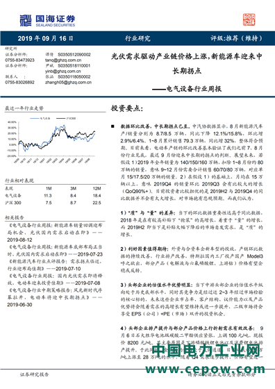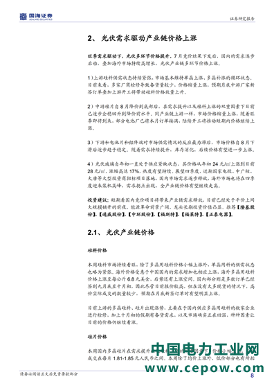 3)下游和电池片和光伏组件端对市场供需情况的反应最为滞后,市场价格自 8 月下滑后逐步趋于稳定。目前由于下游厂商在产业链中库存压力最大,随着需求持续提升,库存消化,后续价格有望进一步上涨。