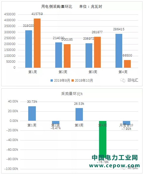 与2019年9月环比分析,富余电量月度增量总体需求下降-7.91%,除第1周和第3周略有增长外,第2周和第4周有不同程度的减少。符合用电侧的波动范围。
