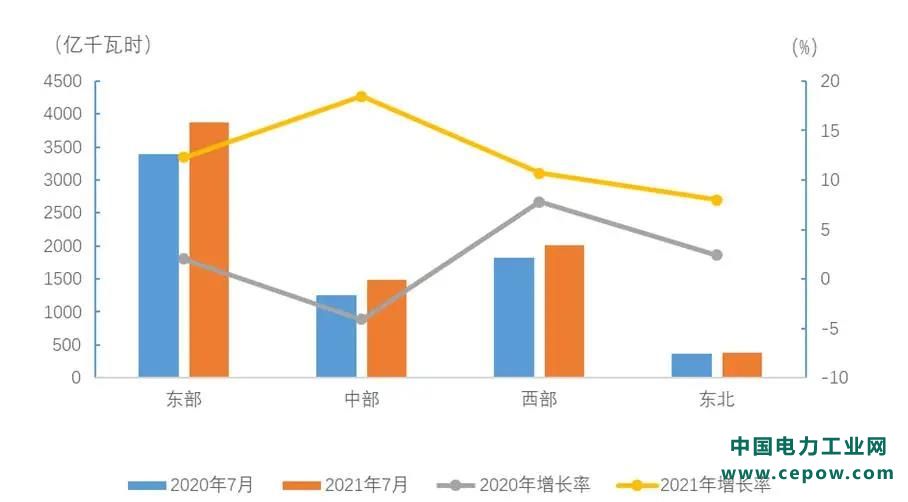 7月份,东、中、西部和东北地区全社会用电量增速分别为12.3%、18.5%、10.7%和8.0%。