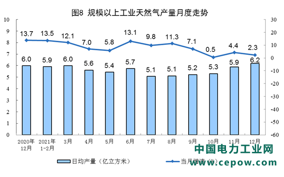 天然气生产放缓。12月份,生产天然气192亿立方米,同比增长2.3%,增速比上月放缓2.1个百分点,比2019年同期增长16.4%,两年平均增长7.9%,日均产量6.2亿立方米。