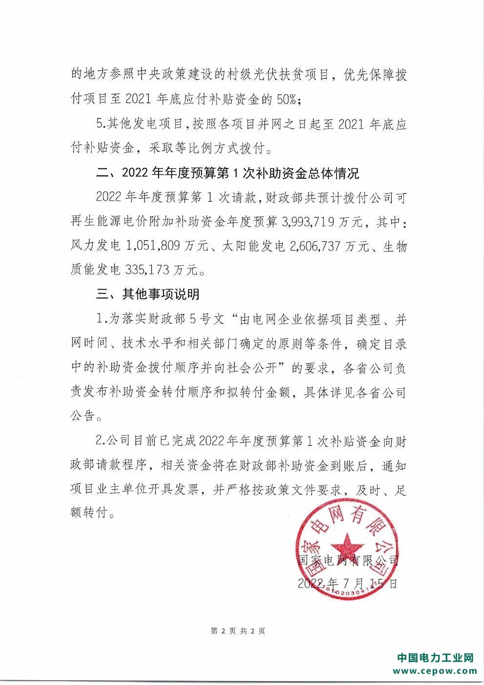 文件指出:2022年年度预算第1次请款,财政部共预计拨付公司可再生能源电价附加补助资金年度预算3,993,719万元,其中:风力发电1,051,809万元、太阳能发电 2,606,737万元、生物质能发电335,173万元。向财政部请款程序,相关资金将在财政部补助资金到账后,通知项目业主单位开具发票,并严格按政策文件要求,及时、足额转付。