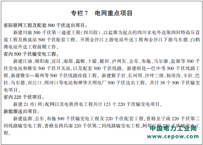 为更好满足“十三五”及以后四川新增大型梯级水电电源送出需要,新建四川资阳—重庆铜梁500千伏输变电工程。新建以盐源为起点的四川水电外送第四回特高压直流输电工程,增加直流外送输电容量1000万千瓦。配合水电和新能源汇集送出,新建马尔康、盐源、会东、布拖等4座500千伏变电站以及配套500千伏线路。