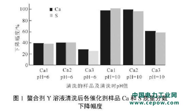 图1将螯合剂Y溶液清洗后各催化剂样品Ca和S质量分数下降幅度(清洗后Ca或S的降低值与失活催化剂相应元素较新催化剂增加值之比)进行了对比。