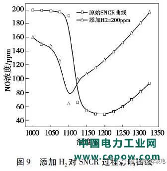 图8所示添加CH4后所得的最佳脱硝温度左移至1113K。这种移动是因为CH4的氧化反应会促进OH的生成,进而影响到了NH3对NO的还原反应。图9所示添加剂H2使最大脱硝效率降低的原因可能与还原剂与烟气中NO的混合程度有关。对比添加剂CH4、H2对SNCR系统的作用效果,在添加200ppmCH4或H2后,最佳温度下的脱硝效率均比原来有所降低。