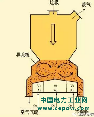 垃圾通过进料斗进入倾斜向下的炉排(炉排分为干燥区、燃烧区、燃尽区),由于炉排之间的交错运动,将垃圾向下方推动,使垃圾依次通过炉排上的各个区域(垃圾由一个区进入到另一区时,起到一个大翻身的作用),直至燃尽排出炉膛。燃烧空气从炉排下部进入并与垃圾混合;高温烟气通过锅炉的受热面产生热蒸汽,同时烟气也得到冷却,最后烟气经烟气处理装置处理后排出。