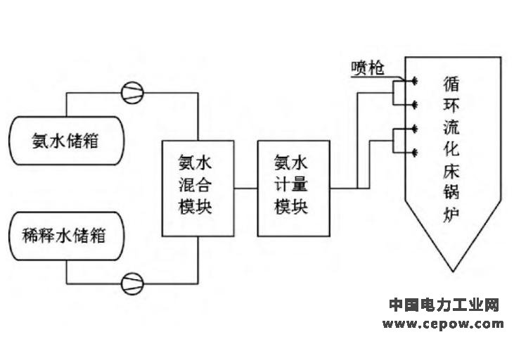 江西晶昊盐化有限公司新建的江西省岩盐资源综合利用年产100万吨纯碱项目配套1×240t/h循环流化床锅炉尾部烟气治理超低排放项目,2020年10月份施工完毕进入调试工作,该工程采用SNCR工艺脱销,由氨水储罐模块、氨水输送模块、稀释水模块、氨水混合模块、计量混合模块、喷射模块和控制模块等组成。使用20%氨水做还原剂,主要工艺见图1。