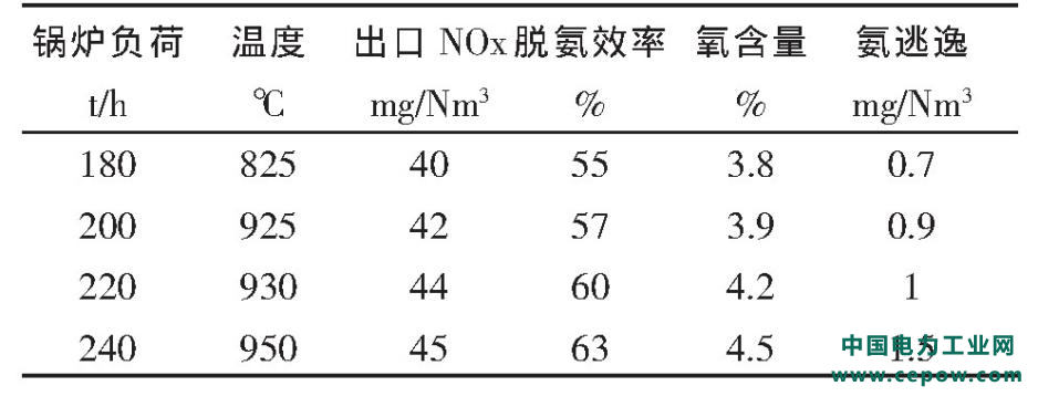 现场通过更改原有喷枪位置后对锅炉脱氨效率进行了实测,经过数据分析得表1,更改位置后的锅炉脱氨率达到60%左右,满足最初设计效果,目前本台锅炉脱销系统工作正常,处理后烟气NOx浓度保持在50mg/Nm3以下。