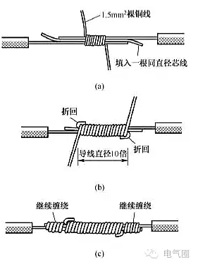 不同截面单股铜导线连接方法如图3所示,先将细导线的芯线在粗导线的芯线上紧密缠绕5~6圈,然后将粗导线芯线的线头折回紧压在缠绕层上,再用细导线芯线在其上继续缠绕3~4圈后剪去多余线头即可。
