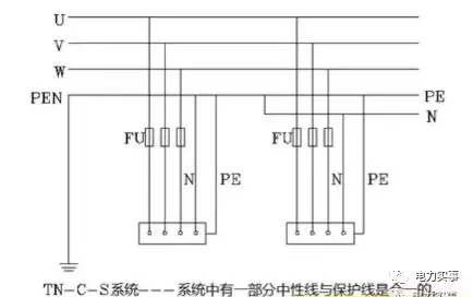 三, TN-C-S 方式供电系统 在建筑施工临时供电中,如果前部分是 TN-C 方式供电,而施工规范规定施工现场必须采用 TN-S 方式供电系统,则可以在系统后部分现场总配电箱分出 PE 线。这种系统称为 TN-C-S 供电系统。