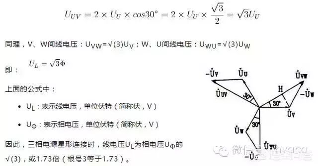 三相电源星形(Y)连接时,电压的相量图如右下图所示。从相量图可以看出:线电压和相电压间的数值关系可由等腰三角形中求得。U、V间线电压: