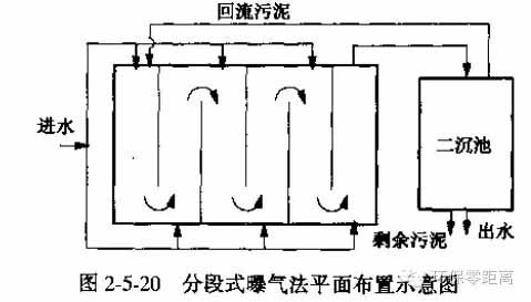 分段曝气活性污泥运行模式又称阶段进水活性污泥法或多段进水活性污泥法,其特点是废水沿池长多点进水,有机负荷分布均匀,使供氧量均化,克服了推流式供氧的弊病。沿池长F/M分布均匀,充分发挥其降解有机物的能力。该法可提高空气利用率,提高池子工作能力,适用各种范围水质。该工艺的不足是,进水若得不到充分混合,会引起处理效果的下降。图2-5-20是分段式曝气法平面布置示意图。