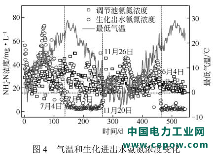 温度是影响生化体系中硝化的重要因素,温度较低时硝化菌的生长繁殖能力和活性均较低,在30℃左右时硝化能力达到最高。在常见的污水处理中,较低的温度是影响硝化反应的因素。从图4可以看出,当地的周年气温变化显著,且具有一定的规律性。