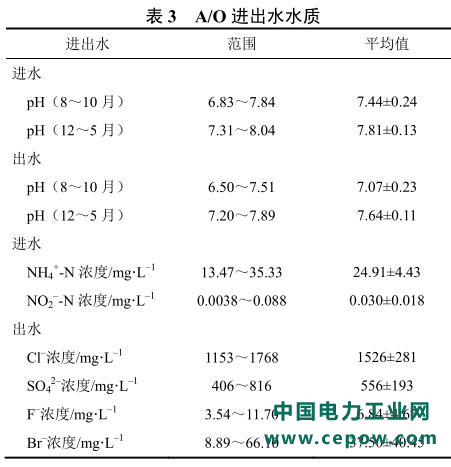 整个生化系统的 pH 进水要求为 6~9(表 1),通常整个工艺中调节池中的 pH 在 7.5 以上,在稳定达标的 8~10 月,经过水解酸后 pH 略有下降(未列出),经 A/O 后 pH 进一步下降(表 3),这与硝化作用消耗碱度有关。
