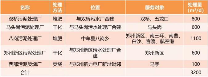 郑州市现状污泥处理厂包括八岗污泥处理厂、郑州市污泥处理应急工程、马头岗、双桥及郑州新区污水处理厂,合计污泥处理量为2 300m³/d。刚刚建设完成的郑州新区污水处理厂二期工程采用污泥干化焚烧工艺,处理量为1 000m³/d。