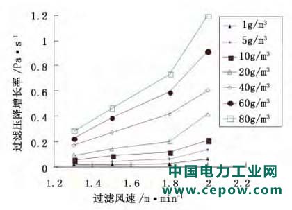 图3不同袋区入口浓度下过滤压降增长率随过滤风速的变化