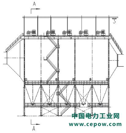 如图1为典型F型结构电除尘器,阴极振打为侧面机械振打,常规分区形式为每个电场一个供电分区,每个电场单独配一套阴极振打装置和高压供电电源。