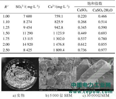 采用VisualMINTEQ3.1软件模拟计算不同浓缩比条件下原水中硫酸钙饱和指数,结果见表2。硫酸钙晶体的饱指数增加,沉淀析出的可能性增大。当浓缩比达到1.75时,开始出现的白色结晶物。图6为浓缩结晶物的实物照片、SEM和XRD照片。综合分析,纳滤浓缩结晶产物为硫酸钙晶体。因此,在纳滤处理过程中,及时去除硫酸钙结晶产物是控制膜污染和减少膜清洗次数的关键。