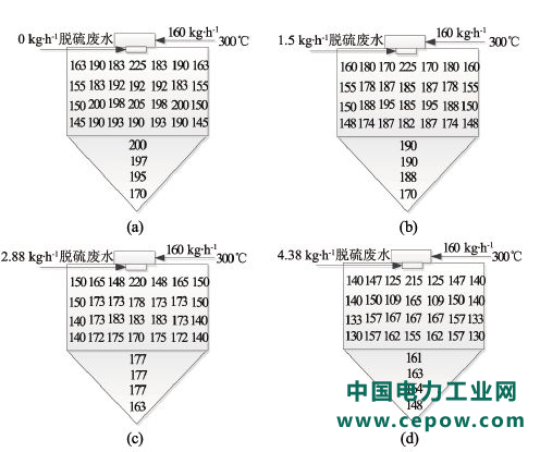 塔体温度变化可以显示不同区域内脱硫废水的蒸发特性,温度下降越多,说明此区域蒸发反应越激烈。