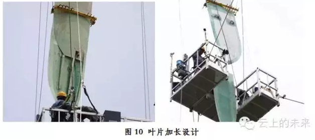 (3)机组的发电量与风轮的扫风面积成正比,即与风轮直径的平方成正比,简而易行的办法就是加长叶片的长度。国内已有1.5MW机组的77机型采用直接换掉改为82机型的事例(直接将37.5米叶片更换为40.25米的叶片)。为了降低成本,图10是采用了在叶片尖部加长来提高发电量的办法。
