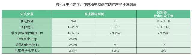 IT 系统中,L - PE 的Uc = UL - L,由于UL -L=690V±10 % , Uc 可选择750V ;在并网侧, 参照GB50057 - 2010 中4.3.8 第4 款的规定,每一保护模式的冲击电流当无法确定时应取≥ 12.5kA 的T1 类SPD,同时根据GB 50343 - 2012《表5.4.3 - 3 电源线路浪涌保护器冲击电流和标称放电电流参数推荐值》,也可采用≥ 50kA 的T2 类SPD, 因此对于TN - C 系统Uc 可选择为 440V, IT系统Uc 可选择 750V。发电机定子、变流器电网侧的防护产品推荐配置见表4。
