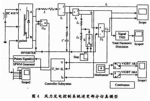设计的永磁直驱风力发电系统发出电压在18~50 V之间变化时,经过电能变换电路的处理得到稳定的220 V电压,通过研究得出在设计整流及Boost升压变换电路的控制策略时,应该以控制输出电压为出发点,使输出电压保持恒定为目的,且同时要保证系统功率因数尽可能的接近于1,综合风电系统特殊环境及Boost变换的电路CCM工作特性的基础上,控制系统的设计中采用了平均电流控制技术,结构上为电流内环和电压外环构成双闭环结构;而对于逆变电路部分则在电路的控制方式上选用正弦脉宽调制方式对逆变电路进行控制,设计了采用PI调节器及PWM控制的电路控制策略。在确定了系统中电路的运行状态后,确定了电路参数,并利用Matlab\Sireulink搭建了电能变换电路逆变部分的仿真模型,如图4所示。