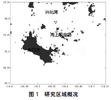 研究海域位于兴化湾外侧,南日岛东北侧。兴化湾位于福建省沿海中段,海湾总面积619.4 平方公里。兴化湾口朝向东南,出南日群岛与台湾海峡相通。规划海上风电场位于兴化湾与台湾海峡连接相通处,规划面积约80km2(如图1 所示)。