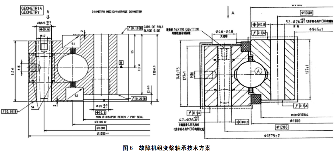 根据该型机组变桨轴承的损坏状况和失效模式,在现有轴承连接尺寸和设计条件下,对该型机组变桨轴承进行技术升级,主要体现在以下两个方面,如图6 所示。