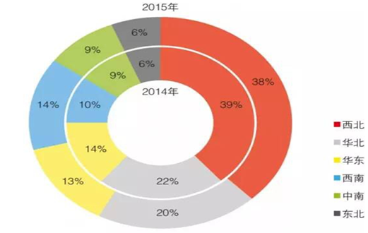 2014年和2015年中国各区域新增风电装机容量份额对比