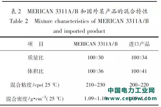 表1 和表2 分别列出了MERICAN 3311A/B 和国外某产品这两种环氧树脂体系的基本特性参数和混合特性参数。可以看到,MERICAN 3311A 树脂的粘度比国外产品的树脂组分粘度要高,一般风电叶片用树脂部分是由通用型环氧树脂( 127 或128) 和活性稀释剂组成的,显然,国外产品树脂组分里稀释剂的用量要比MERICAN 3311A 多,稀释剂的主要作用是降低环氧树脂配方体系的粘度,改善工艺性能,但它的加入势必会对固化收缩、固化物性能以及树脂组分的成本等产生一定的影响。尽管MERICAN3311A 的粘度相对较大,但值得注意的是,从表2 中可以看到,两种树脂体系的混合粘度均比较低,为200——250 mPa˙s,符合真空灌注工艺对树脂低粘度的要求。另外,进口产品体系中固化剂的用量比例( phr = 34) 略大于MERICAN 3311B( phr = 30) ,而对于环氧树脂体系,通常固化剂组分的成本远大于基础树脂组分,因此,MERICAN 3311A/B 组合料应该在成本上占有更大的竞争优势。