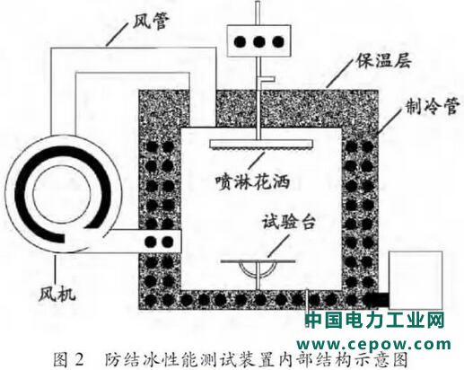 根据调研结果,并向风电整机企业及风电叶片防结冰涂料企业征求意见,开发设计出一台风电机组叶片涂料环境模拟试验装置。该试验装置包括试验箱体、制冷系统、控制系统、喷淋系统、制风系统、试验平台6 部分,如图1 所示。试验过程中将涂层样板用夹具固定在试验平台上,通过控制系统开启试验装备,对试验箱体进行制冷,开启喷淋系统和制风系统对试验涂层样板进行喷淋和吹风,通过过冷水模拟雨水环境,通过控制风速大小改变叶片样板表面所受的作用力及调整叶片样板测试角度,来模拟真实环境下叶片表面所受的自然风作用和叶片自身转动的离心作用等。