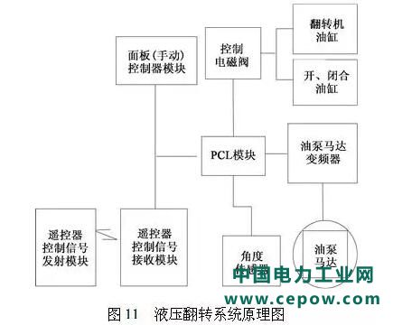 液压翻转是目前国外比较流行的翻转方法。全自动液压翻转设备由翻转架、液压系统以及电控系统3部分组成,不仅可以实现翻转过程的自动化,提高翻转效率,使翻转过程平稳,而且还能更好地保证模具精度和寿命, 提高叶片生产的质量,其液压翻转系统原理如图11所示。