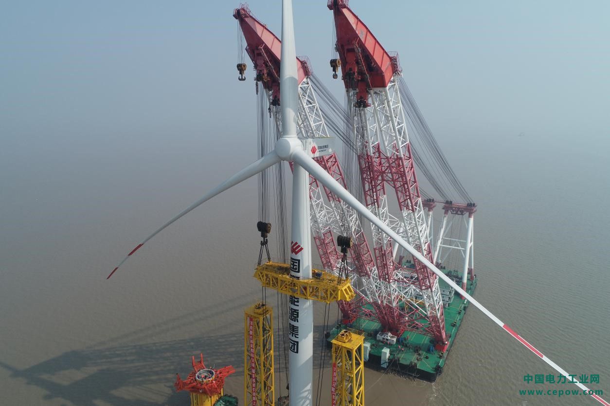 勠力同心、技术创新。该项目海域条件复杂、气象变化频繁,具有典型的潮间带海域特征,根据以往经验,潮间带风电场建设过程中,复杂的海域条件与天气状况会给工程推进带来较大困难。为了克服海上气象阻碍项目建设团队在筹建之初就将目光投向了单桩基础上的整机安装这块未经发掘的技术新领域,国华东台风电场16#机位风机采取“陆上基地整机拼装、海上整机运输、海上整机吊装、兼有软着陆及精定位功能吊装体系缓冲着陆定位安装”(FIS系统)系列流程施工方法,风机整体安装的绝大多数前置工作在陆域进行。