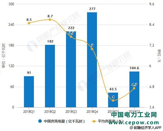 2018-2019年H1中国弃风电量及平均弃风率统计情况