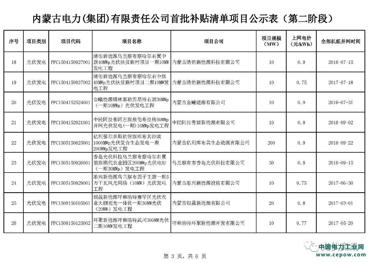 内蒙古电力(集团)有限责任公司关于经营区域内首批可再生能源发电项目补贴清单(第二阶段)的公示