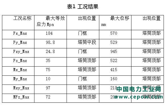 塔筒的位移随高度增加而增大,该工况下塔筒最大位移出现在顶部,为570mm,总体位移分布趋势符合经典材料力学理论。现将各工况结果列表如下进行对比分析,如表1所示。