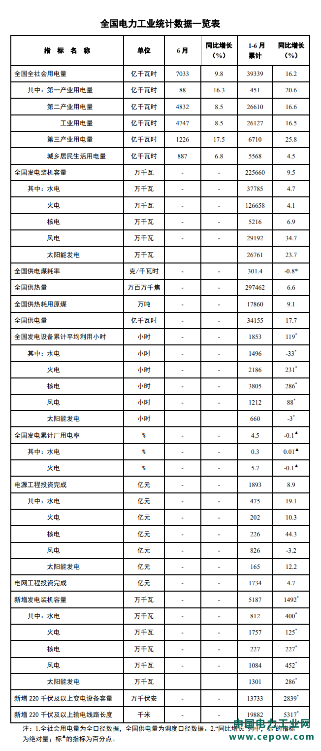 7月16日,国家能源局发布1-6月份全国电力工业统计数据。截至6月底,全国发电装机容量约为22.6亿千瓦,同比增长9.5%。其中,风电装机容量约为2.9亿千瓦,同比增长34.7%。太阳能发电装机容量约为2.7亿千瓦,同比增长23.7%。