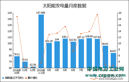 11月全国太阳能发电量为84.87亿千瓦时,累计值为1092.13亿千瓦时,同比增长2.7%,累计增长13.3%。