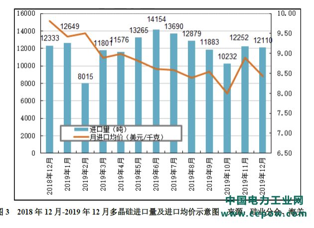 根据海关数据统计,2019年12月份国内多晶硅进口量为12110吨,环比小幅减少1.2%,同比减少1.8%。12月份进口月均价为8.43美元/千克,环比下滑5.2%,同比下滑14.1%。2019年全年多晶硅累计进口量为144506吨,同比增加3.5%。全年进口均价为8.74美元/千克,同比大幅下跌39.0%。值得注意的有以下三点: